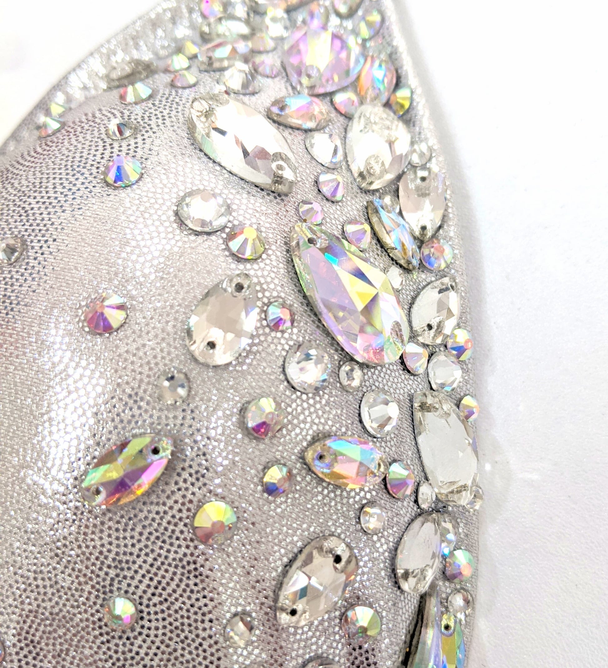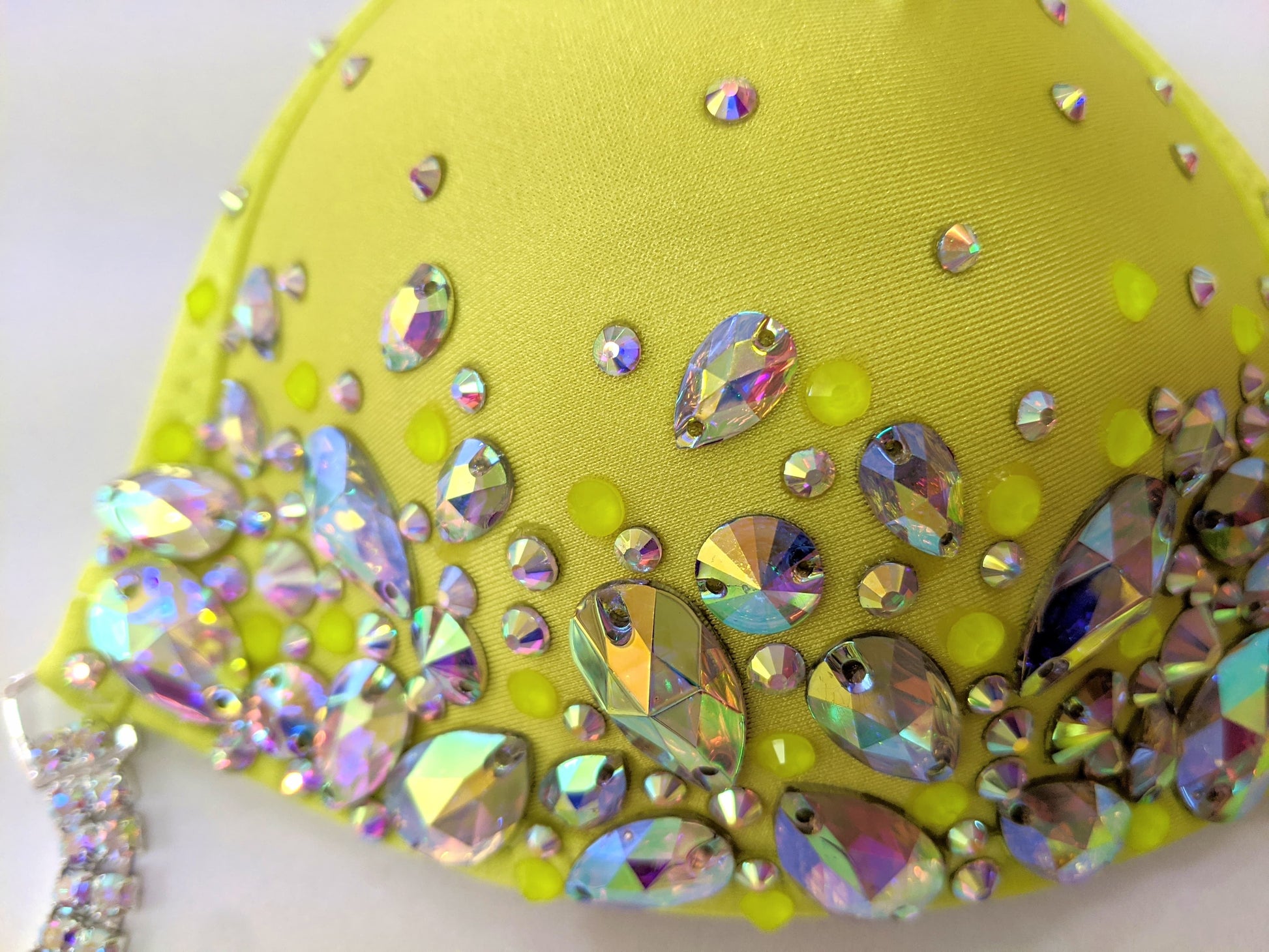 The Mosaic Edge is a Incredible combination of Large and small Crystals , and beautiful Feature stones all centered along the front 1/3 of the bikini top. Its great value and looks amazing. Its both Super sparkly and Textural on stage giving you a point of difference in a big line up of athletes. Our talented designers will blend a gorgeous combination crystals in a your chosen Colour palette , No two Mosaics ever are the same!!