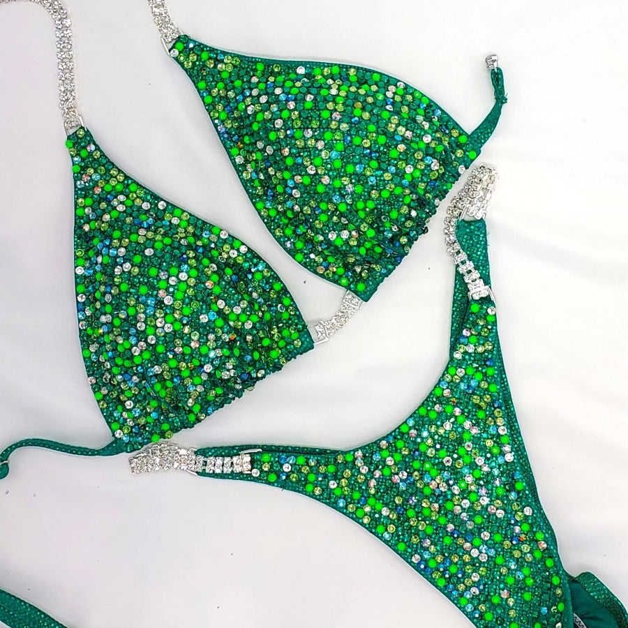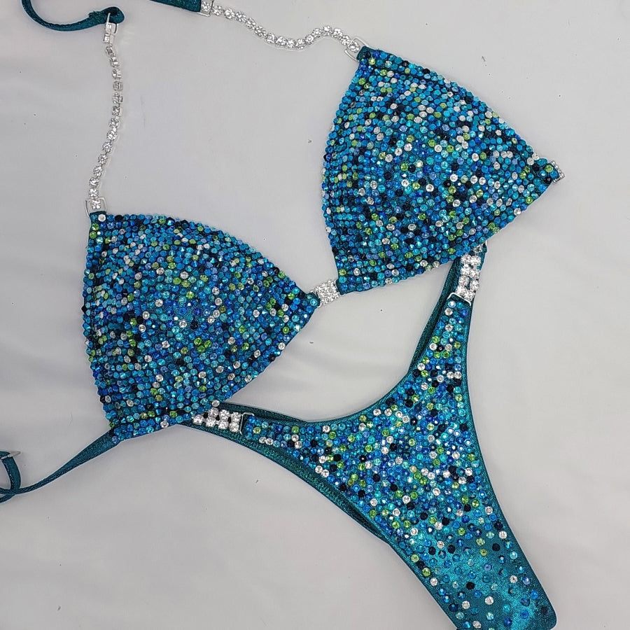 Our clever bikini designers hand place 1000's of Crystals approximately 1mm apart over the entire bikini. This allows only the smallest amount of the fabric colour to show through. It creates a dynamic colour and shine on stage.